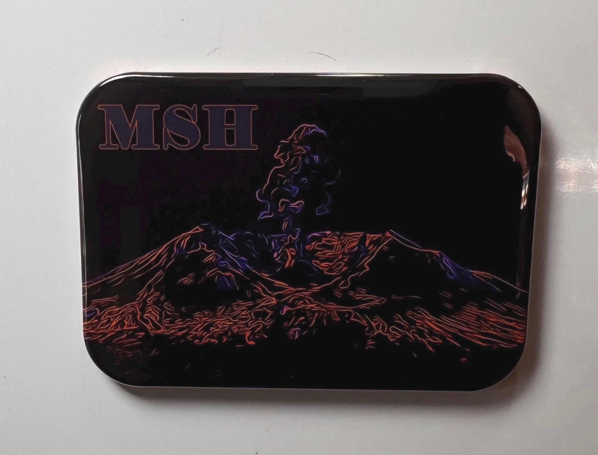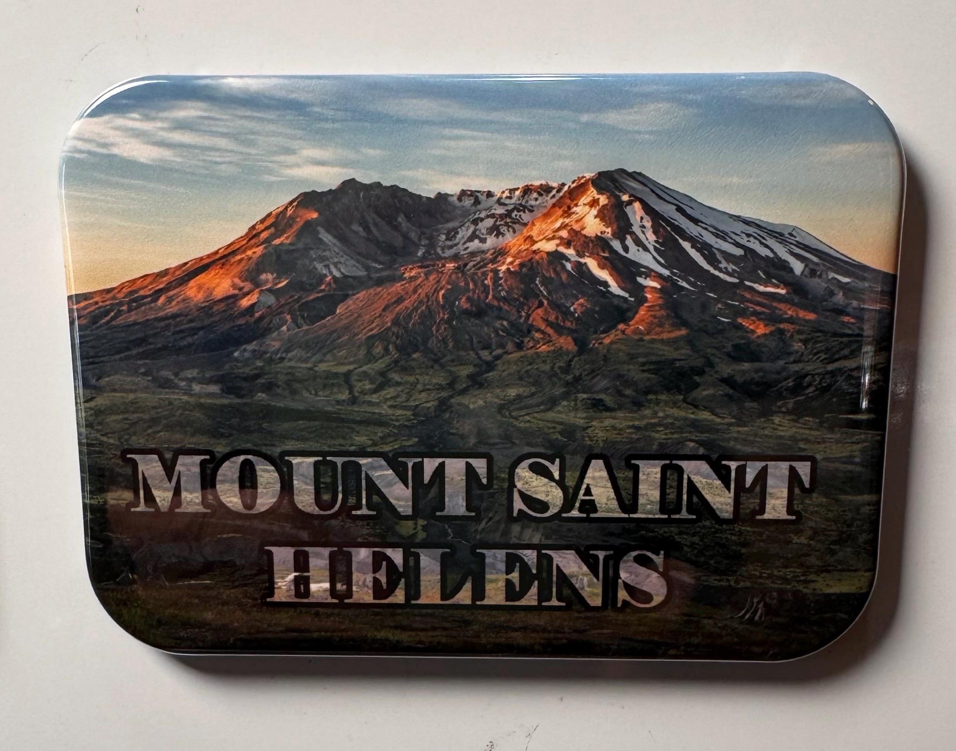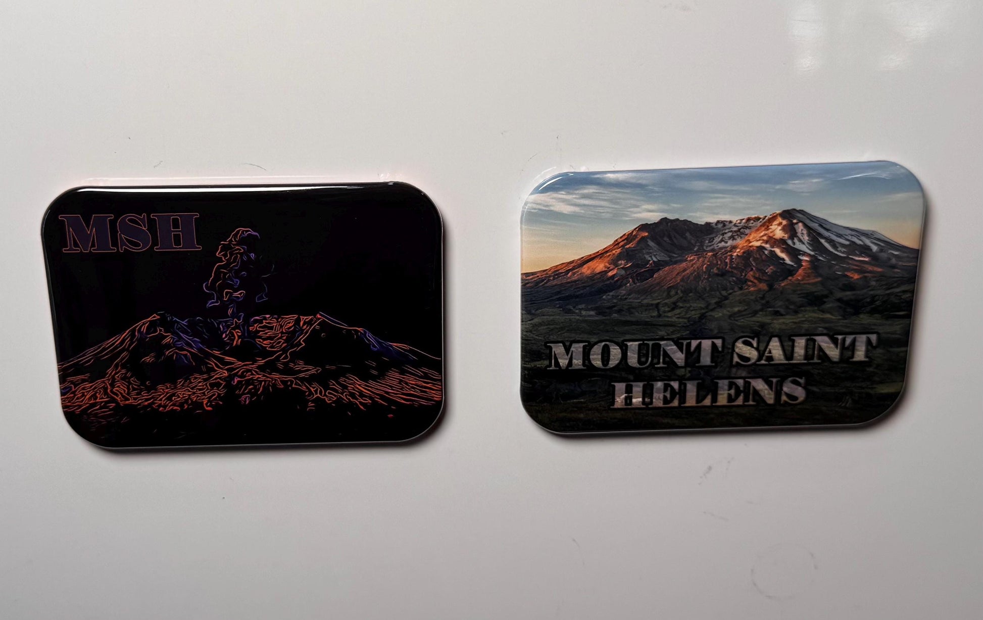 This Mount Saint Helens magnets are 2.5” x 3.5” with a gloss Mylar finish. The first one is a beautiful picture of the mountain, and the second choice is a neon light, abstract picture. Either will look good on your fridge and will be a great souvenir.Our magnets have a medal base. They are very durable. You can feel the quality of the magnet when you hold it in your hand. The mylar finish makes it very glossy. Our magnets are different.